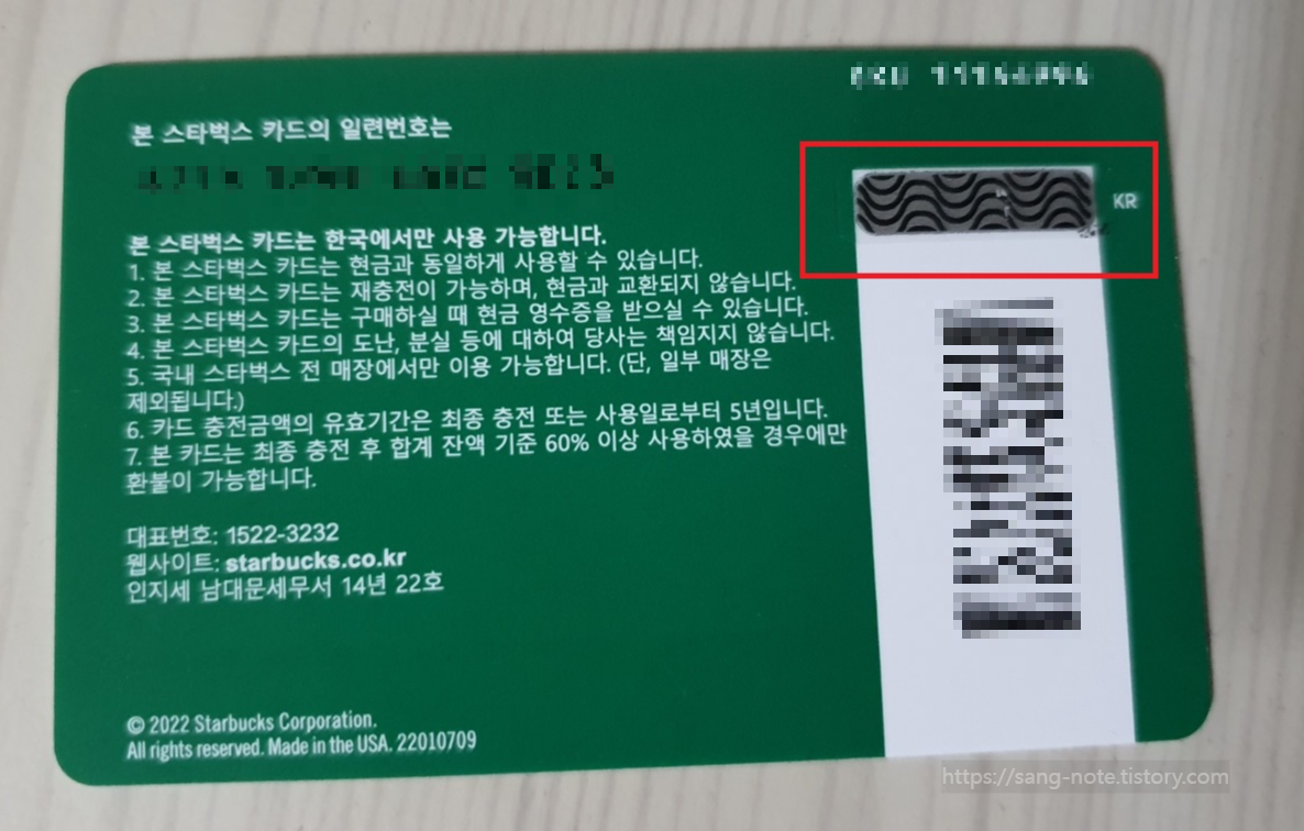 스타벅스 카드 뒷면인데요.