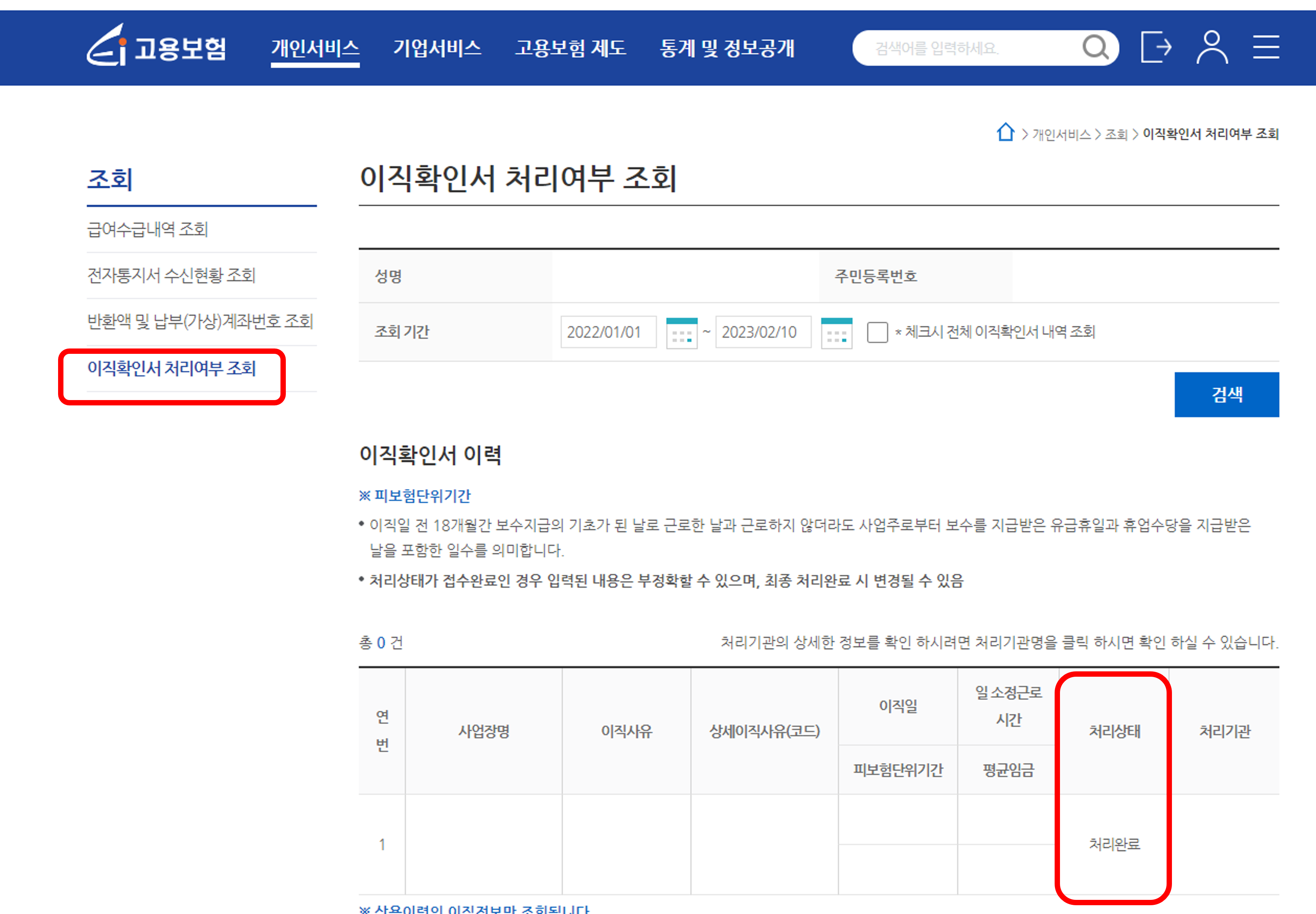 다음은 이직확인서 처리여부를 조회해야 합니다.