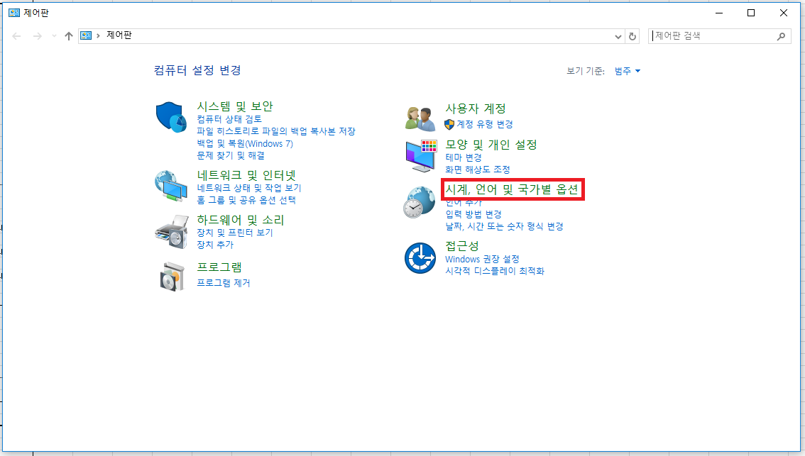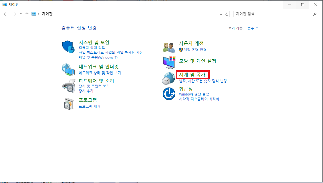 오른쪽 사진처럼 '시계 및 국가'로 되어있다면