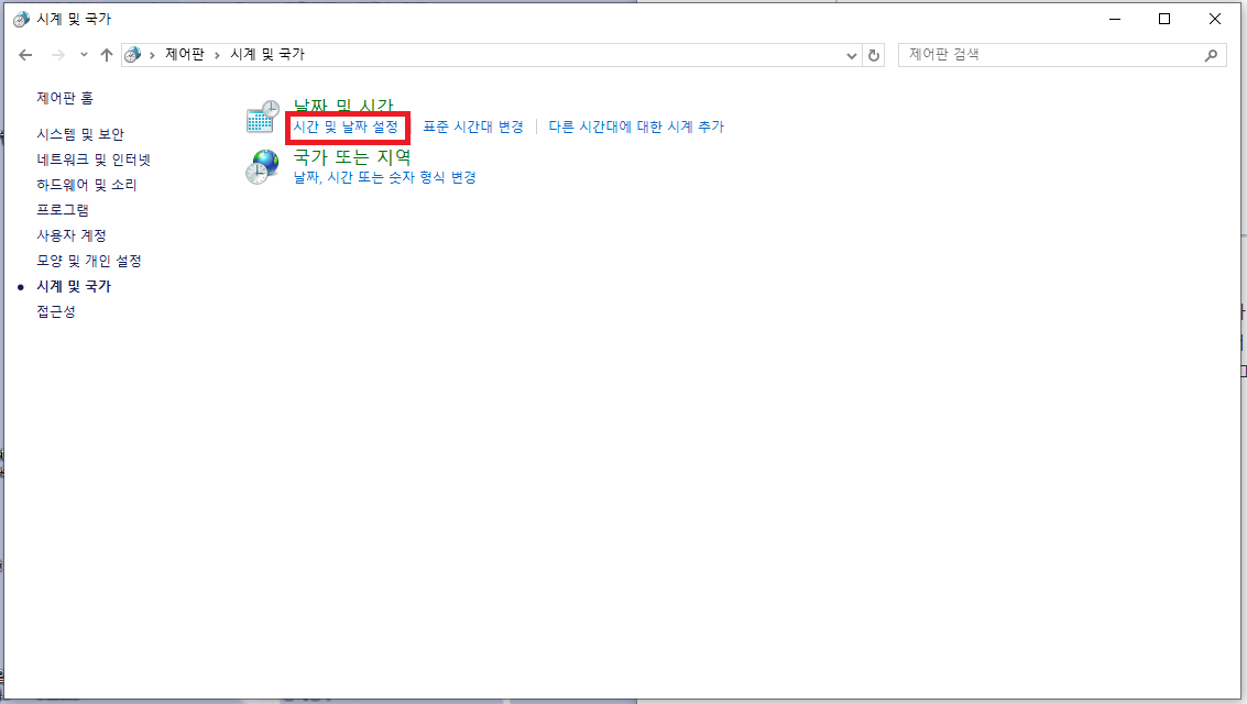 오른쪽 사진처럼 '시계 및 국가'로 되어있다면