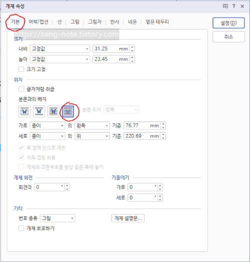 그럼 이렇게 나올텐데요 여기 기본탭에서 본문과의 배치를 '글 뒤로'로 선택해주시면 됩니다.